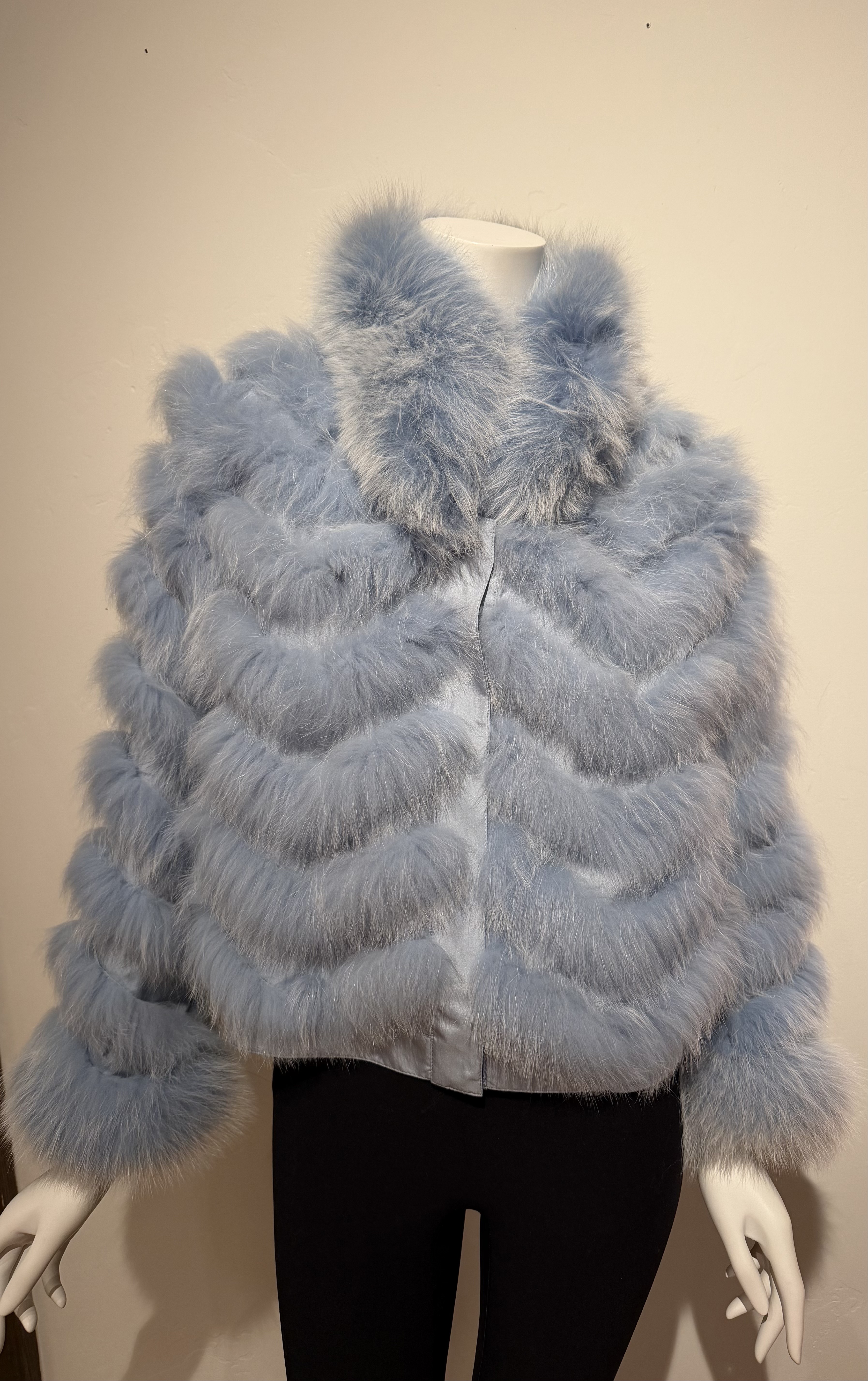 Dyed fox short jacket that is reversible to a nylon if the weather starts up. lightweight and packs well for your travels. Pretty blue the looks great with denim.