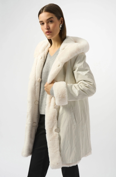 Faux fur hooded coat that reverses to a shiney nylon fabric if the weather changes. Soft and cozy!