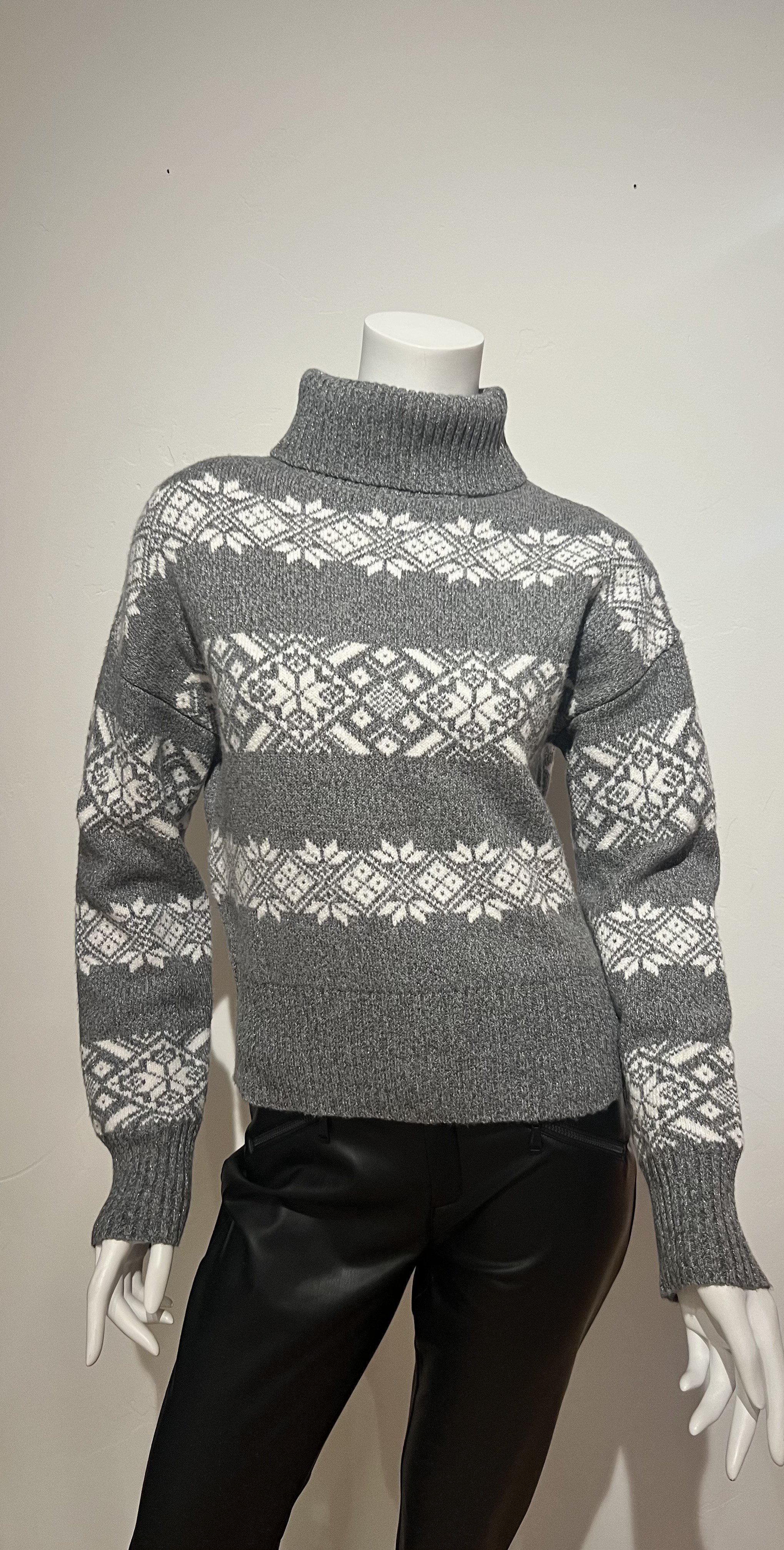 Heidi is a mock neck sweater with ivory rows of snowflakes. The knit is grey with a silver glitter woven in.