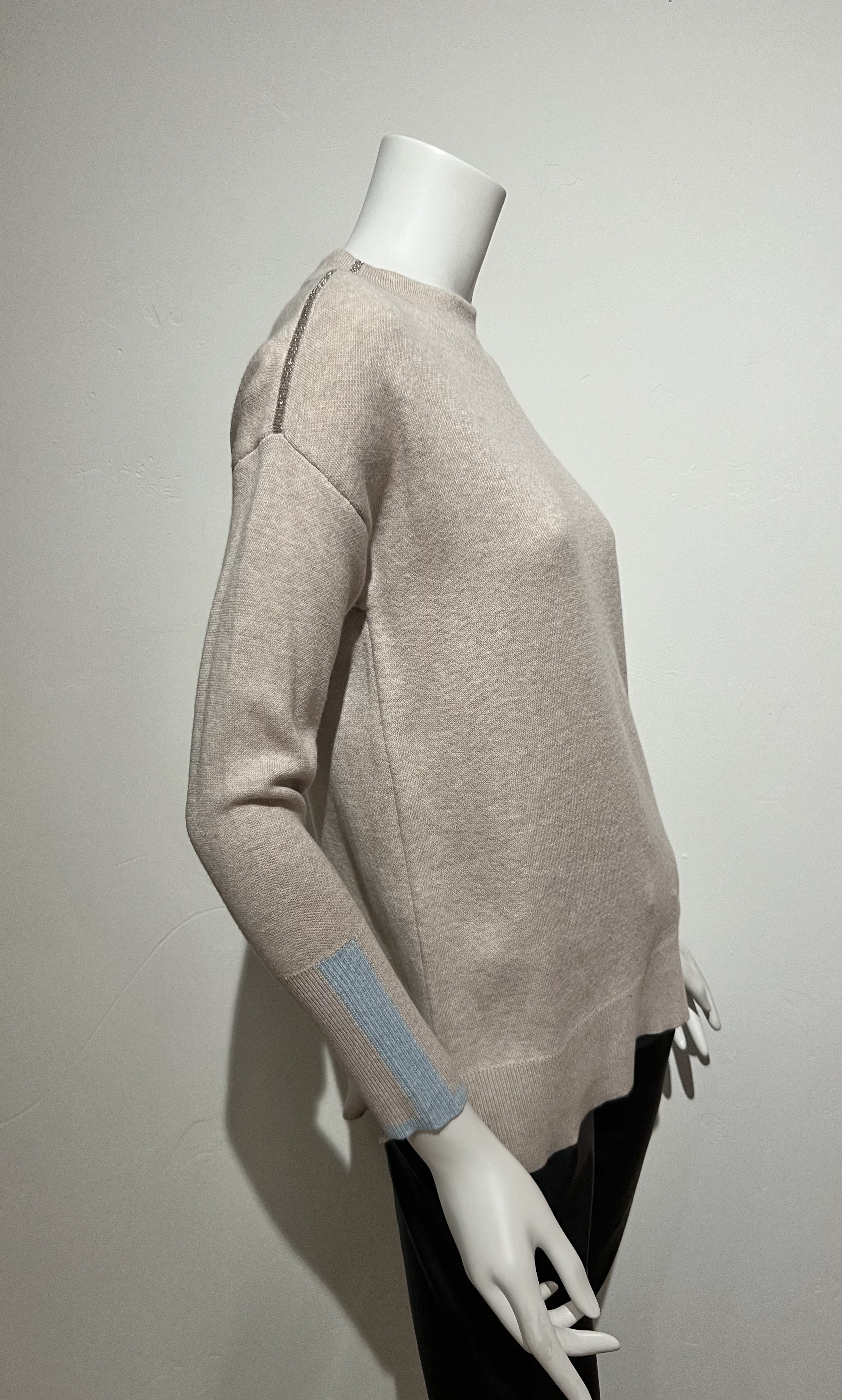 Cotton doubleknit funnel with a pewter lurex stripe on shoulders and a light blue accent on the sleeves...casual glam!