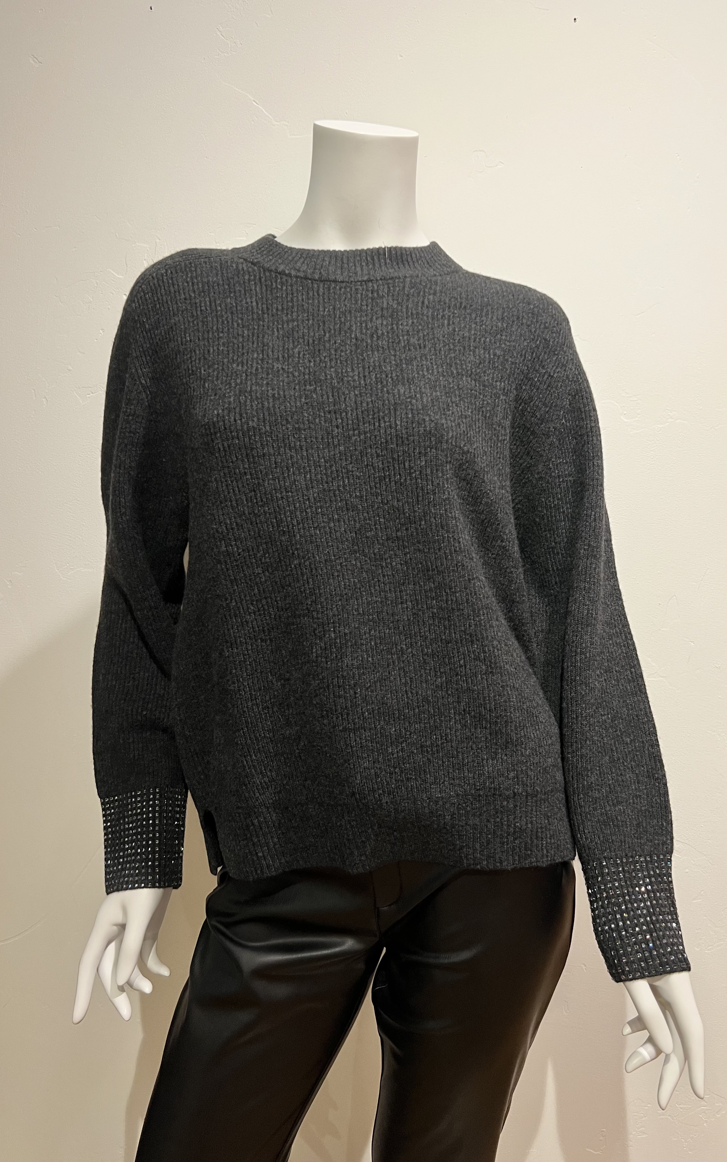 Extrafine merino wool rib sweater with the arm cuffs embellished with tonal crystals...add some pop to a solid sweater!