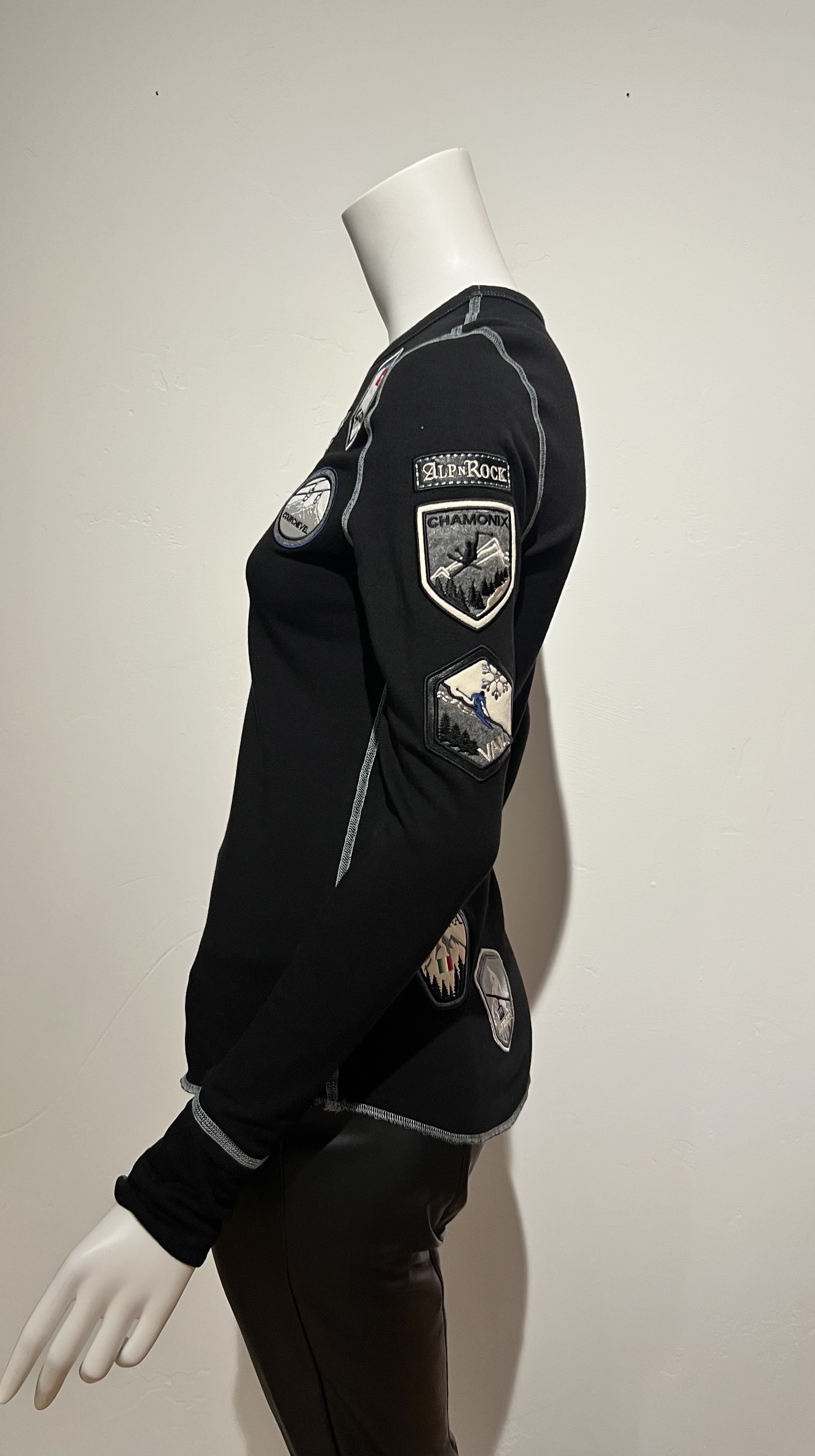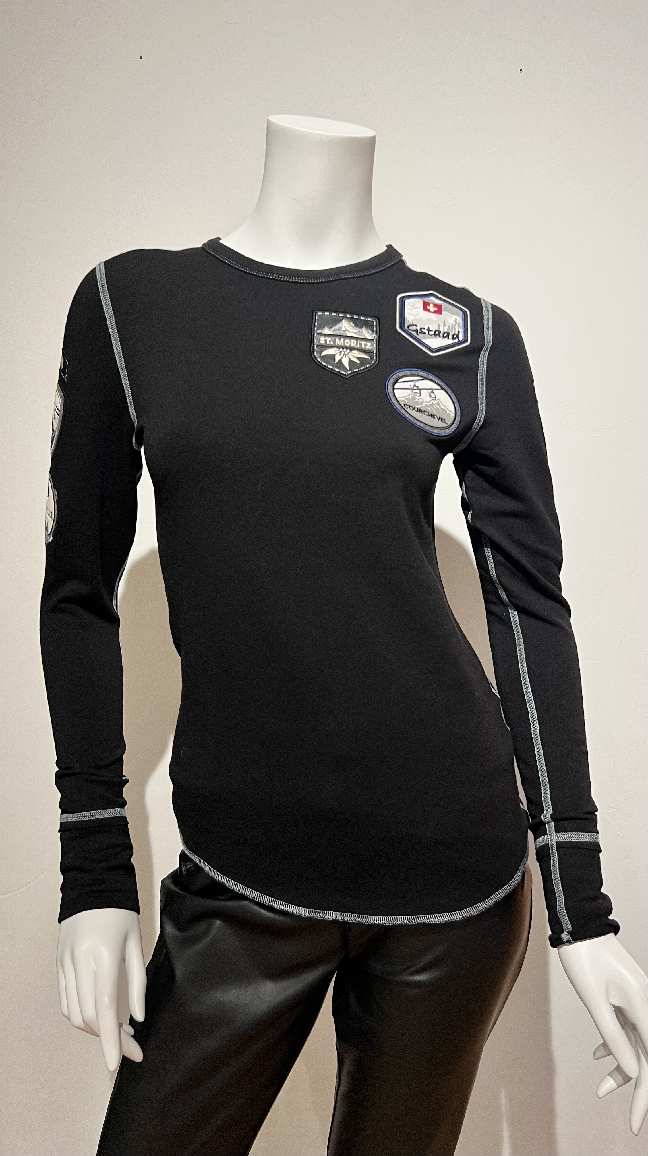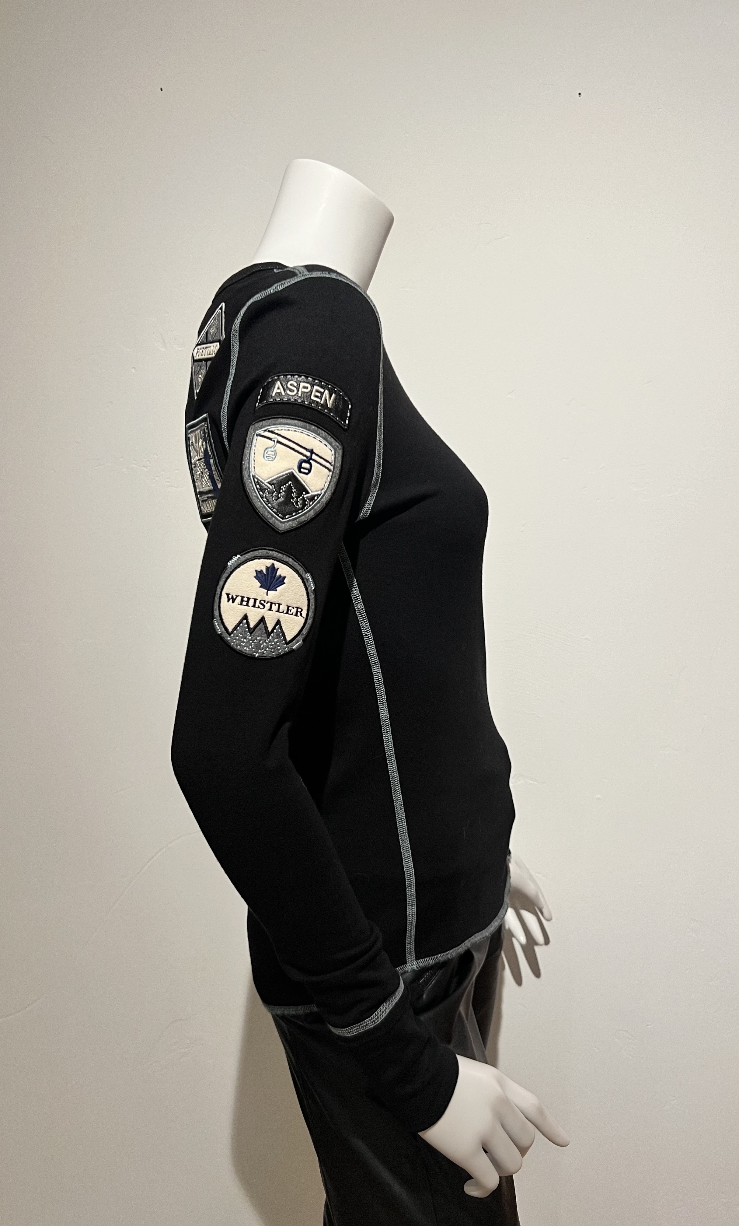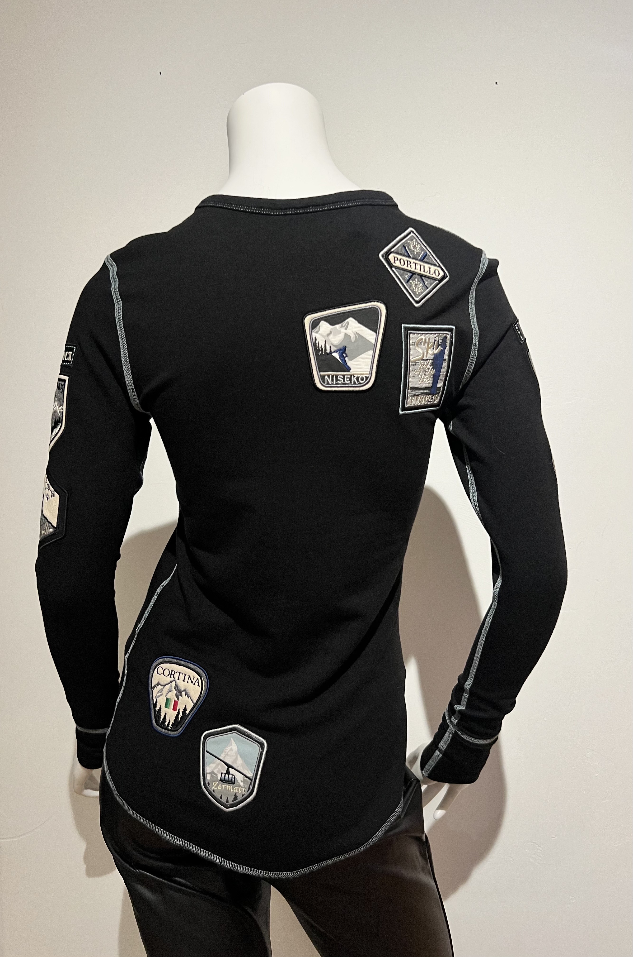 Jetsetter is a crewneck tee with European ski resort patches..St. Moritz, Gstaad, Courchevel, Whistler, Portillo, Verbier...one of our favorite tees!