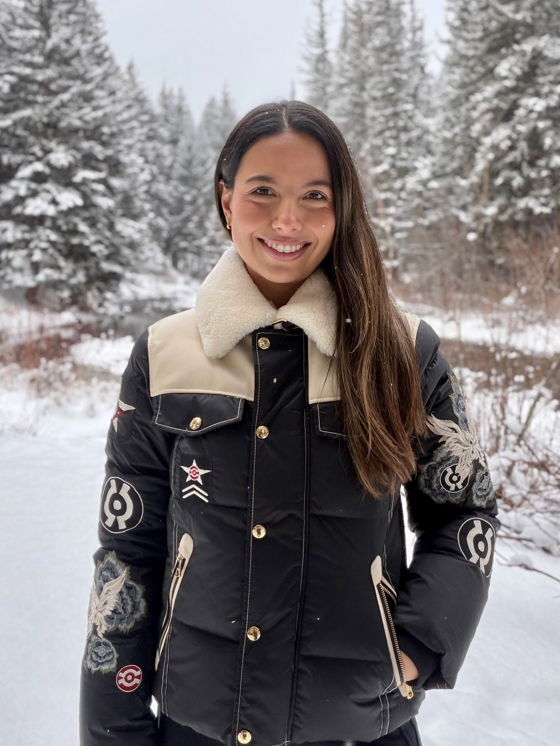 Lady Amia-LD is an exquisite down jacket from Bogner's Heritage Legacy collection with a lamb leather shoulder and beautiful embroidered accents. A collector's jacket!