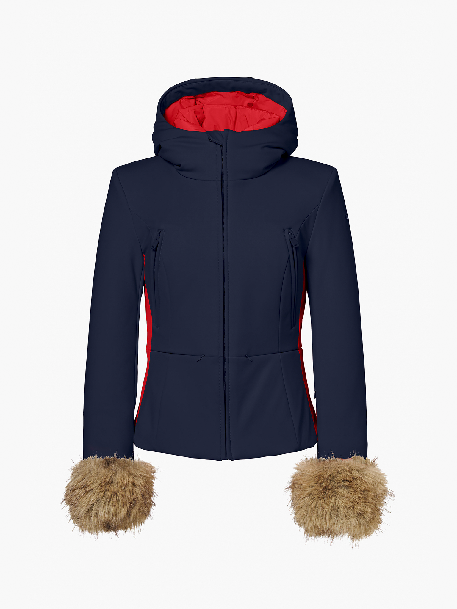 Eden is a fitted softshell 90/10 duck down and primaloft jacket with a side stripe and removeable natural colored faux fur cuffs...the Roccia is the coordinating stretch pant