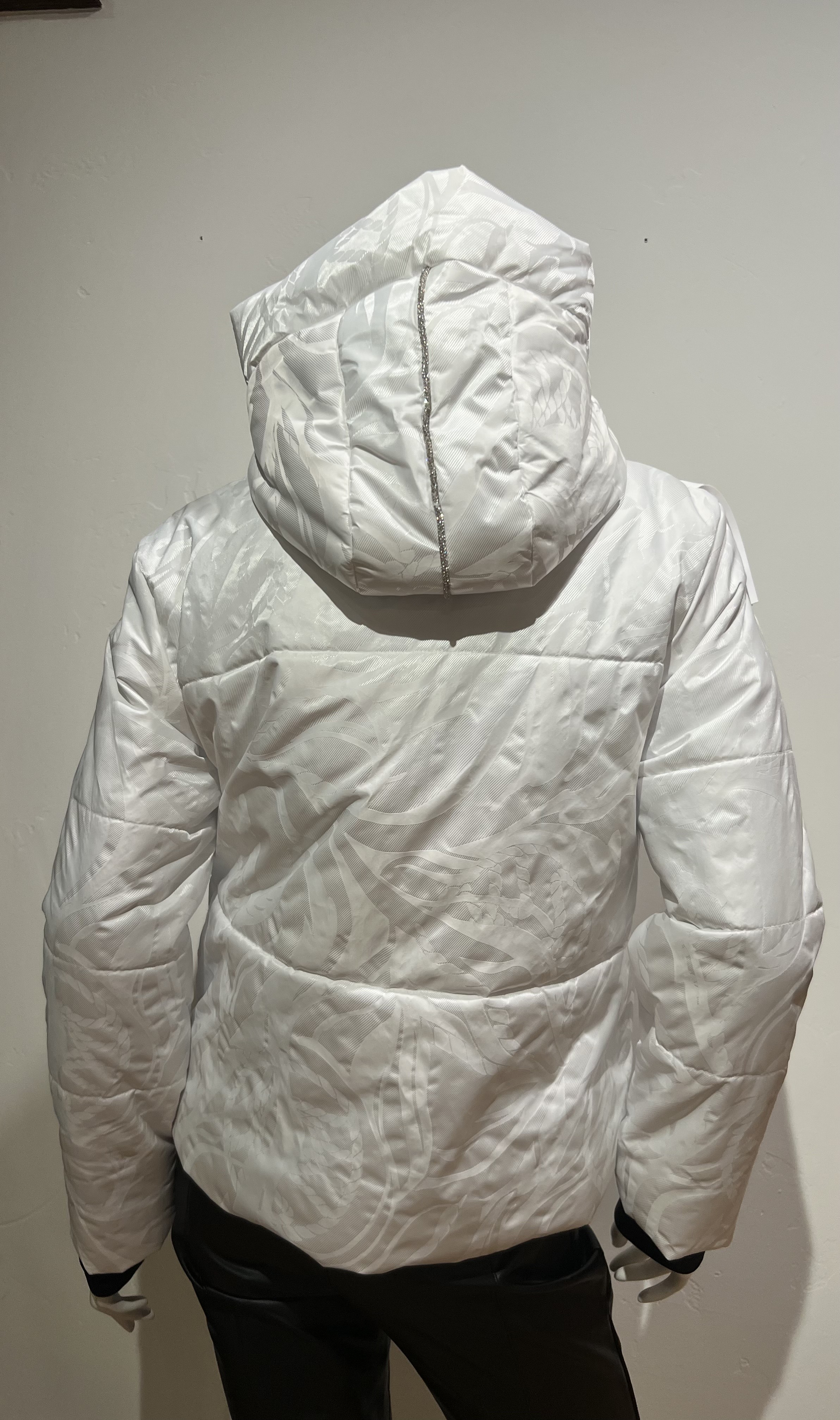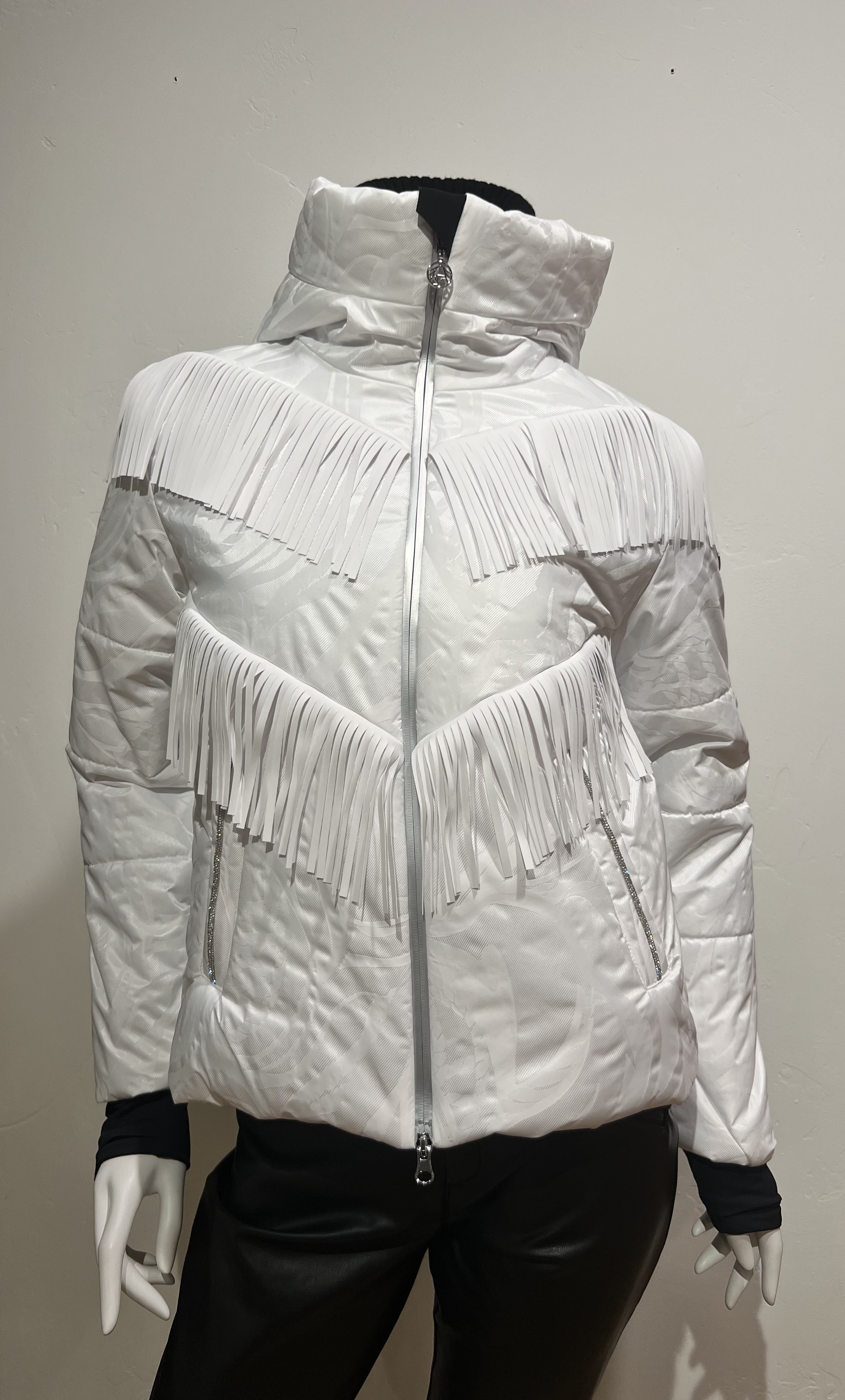 Utah is a fringe jacquard down jacket with crystal accents on pockets and a crystal line down the hood...waterproof, breathable