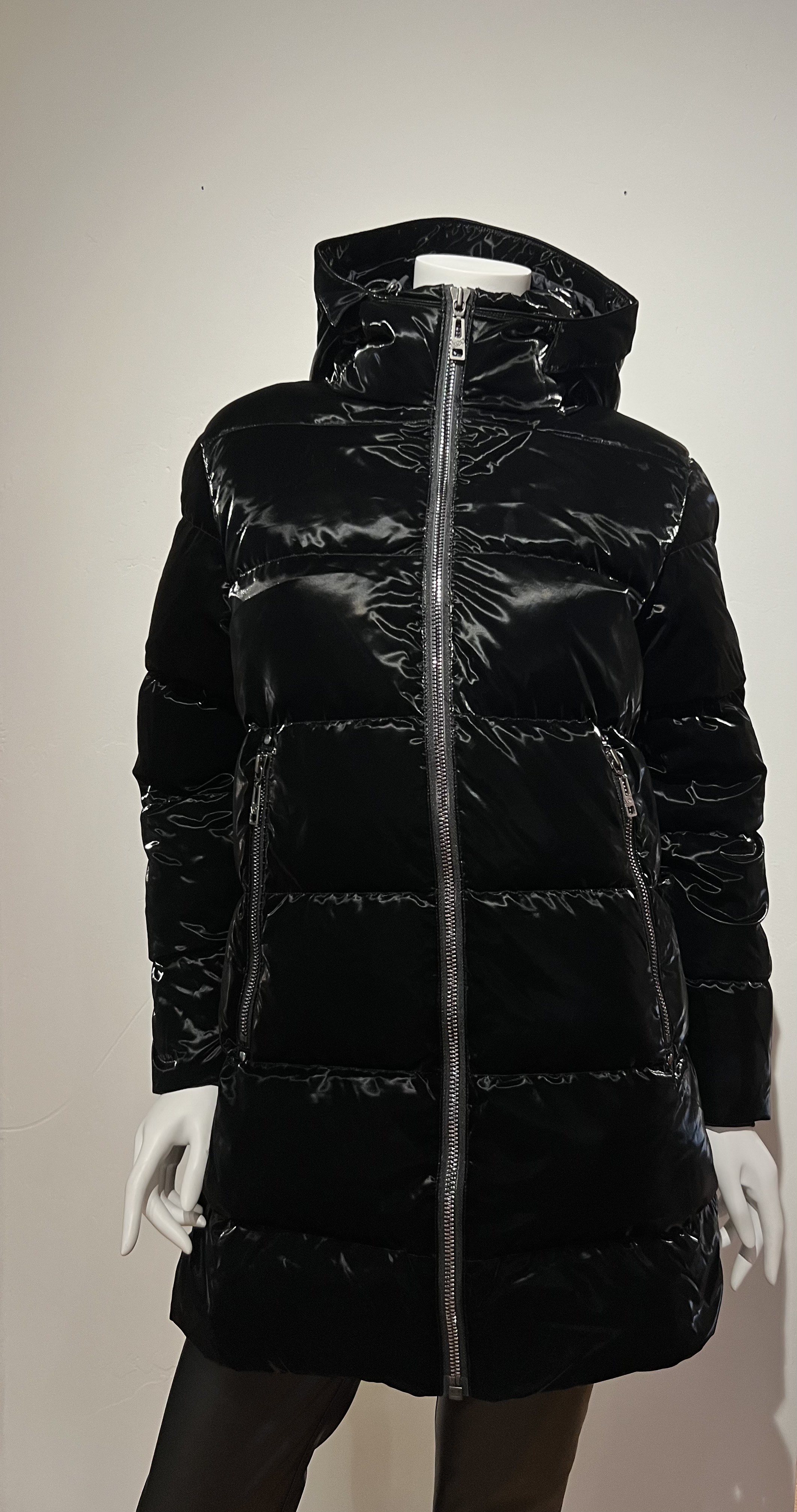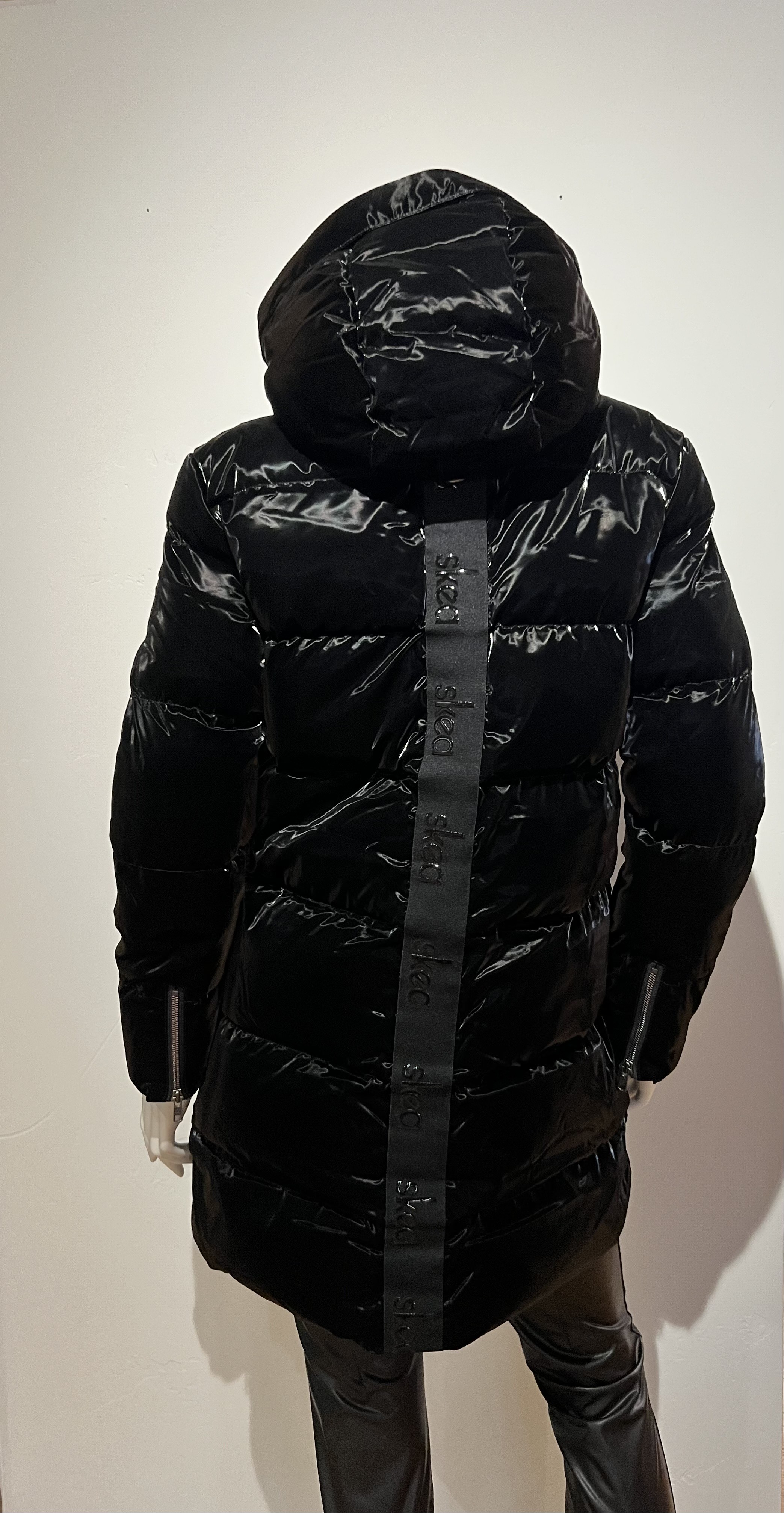 The Taylor is a down filled coat with a black logo tape going down the back. The fabric is super shine and has a two way zipper for comfort while driving. Great coat for the city or the ski resort.