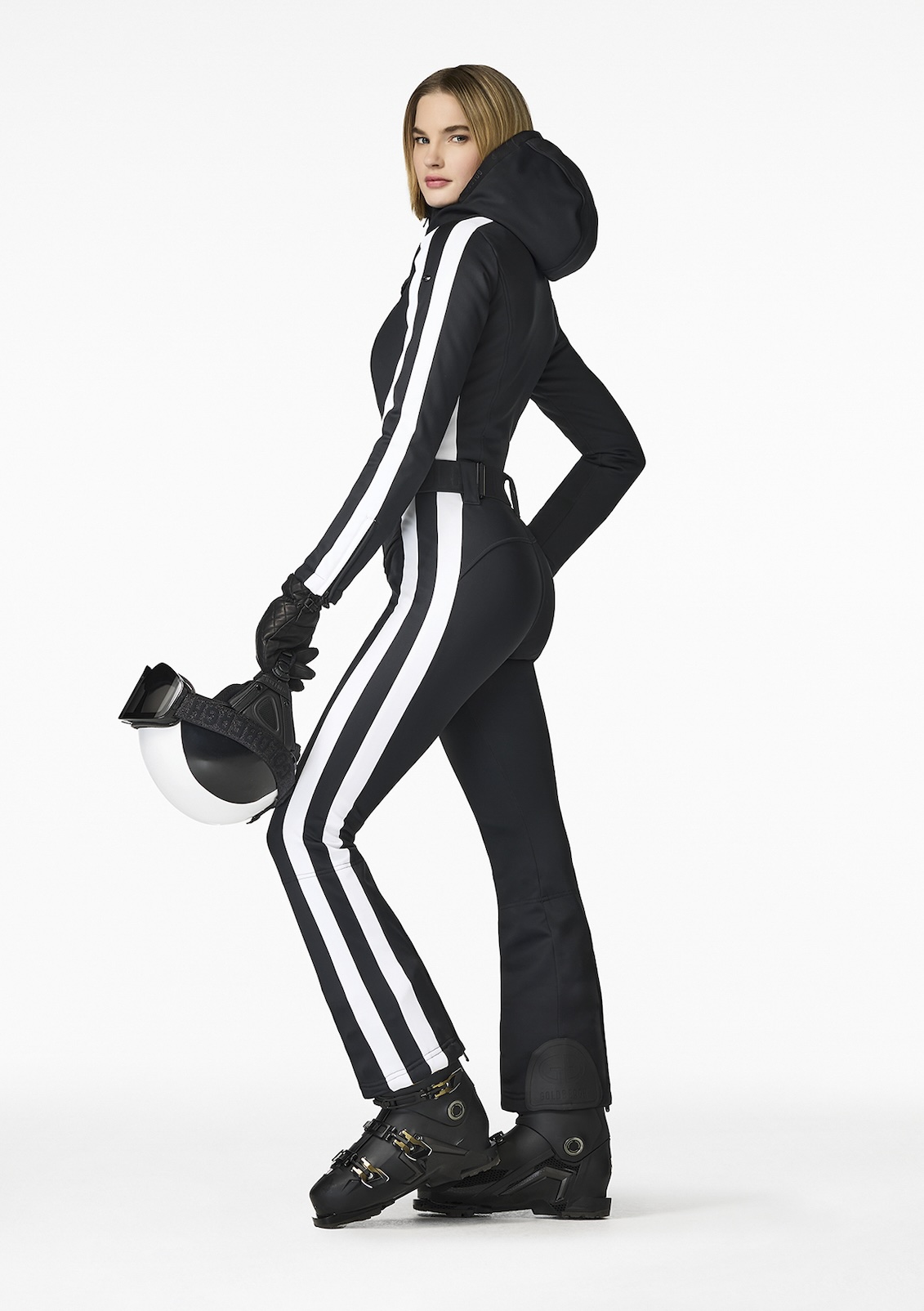 Liah is a stretch one piece suit with white racing stripes down the legs and arms...