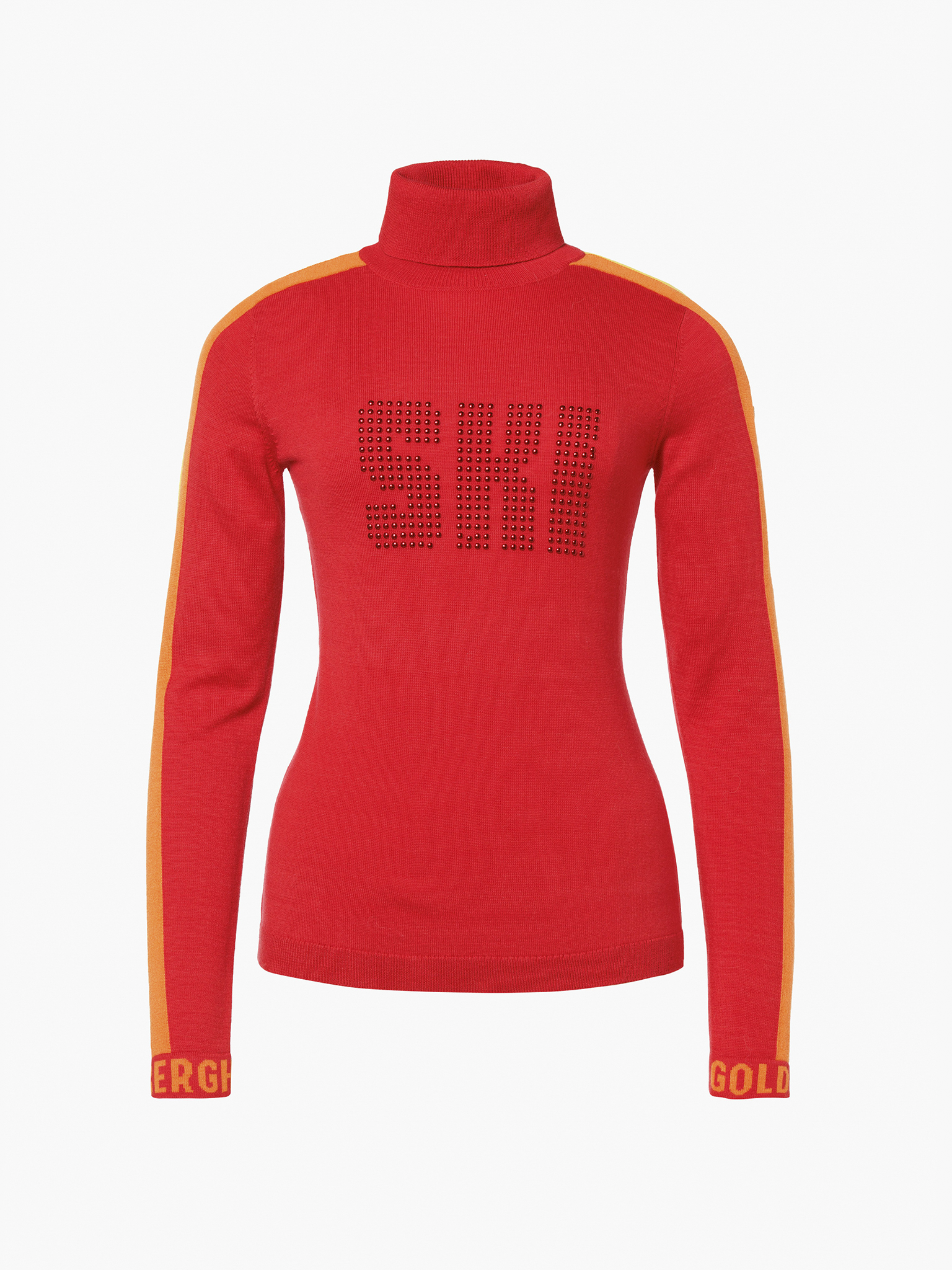 Lucia is a knit mock with SKI set in crystals and accented with side stripes...reboot your solid jackets with the Lucia sweater.