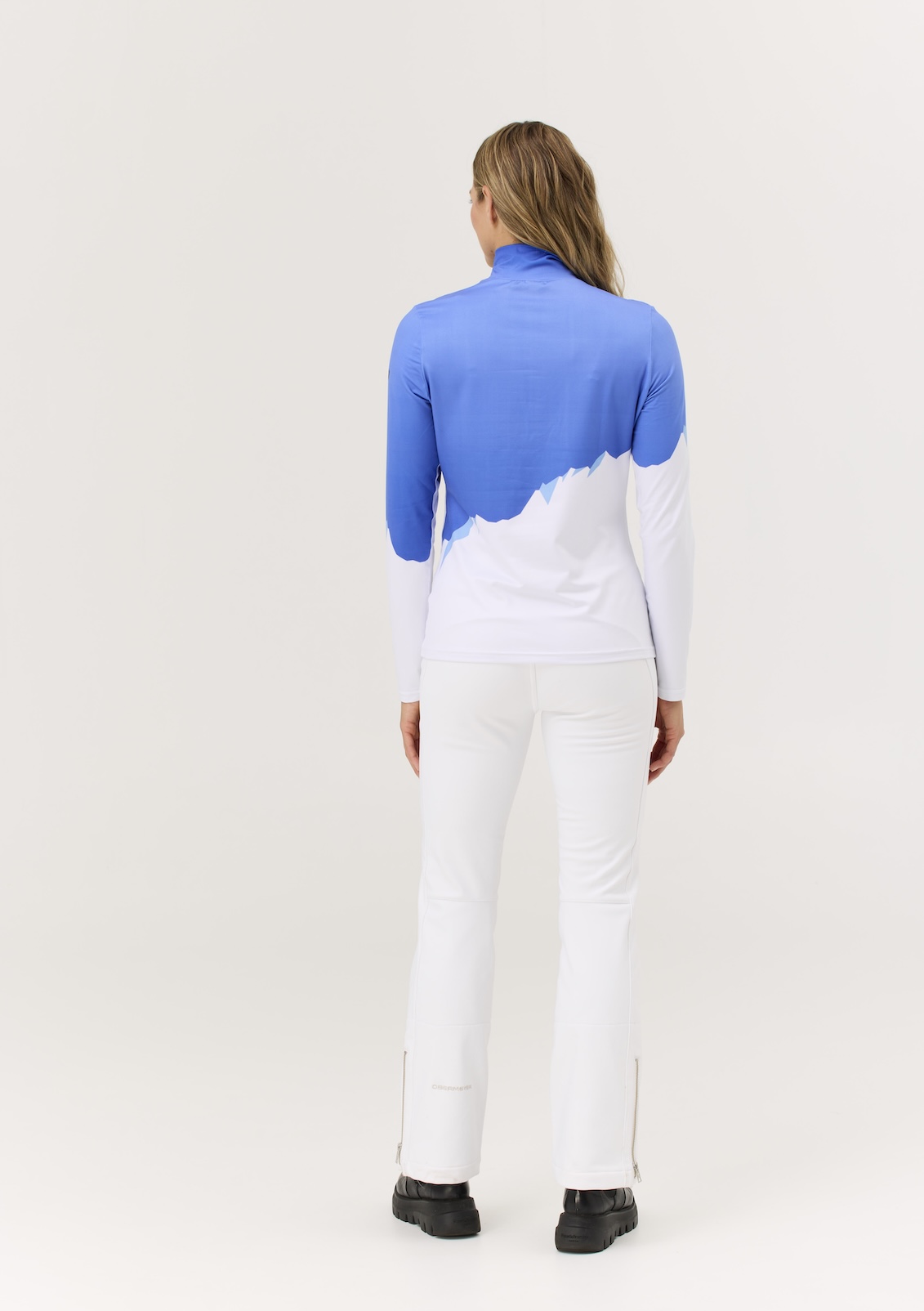 Mountain Pose zip first layer turtleneck portrays a ski racer made up in a beautiful dazzling blue color...Les Alpes