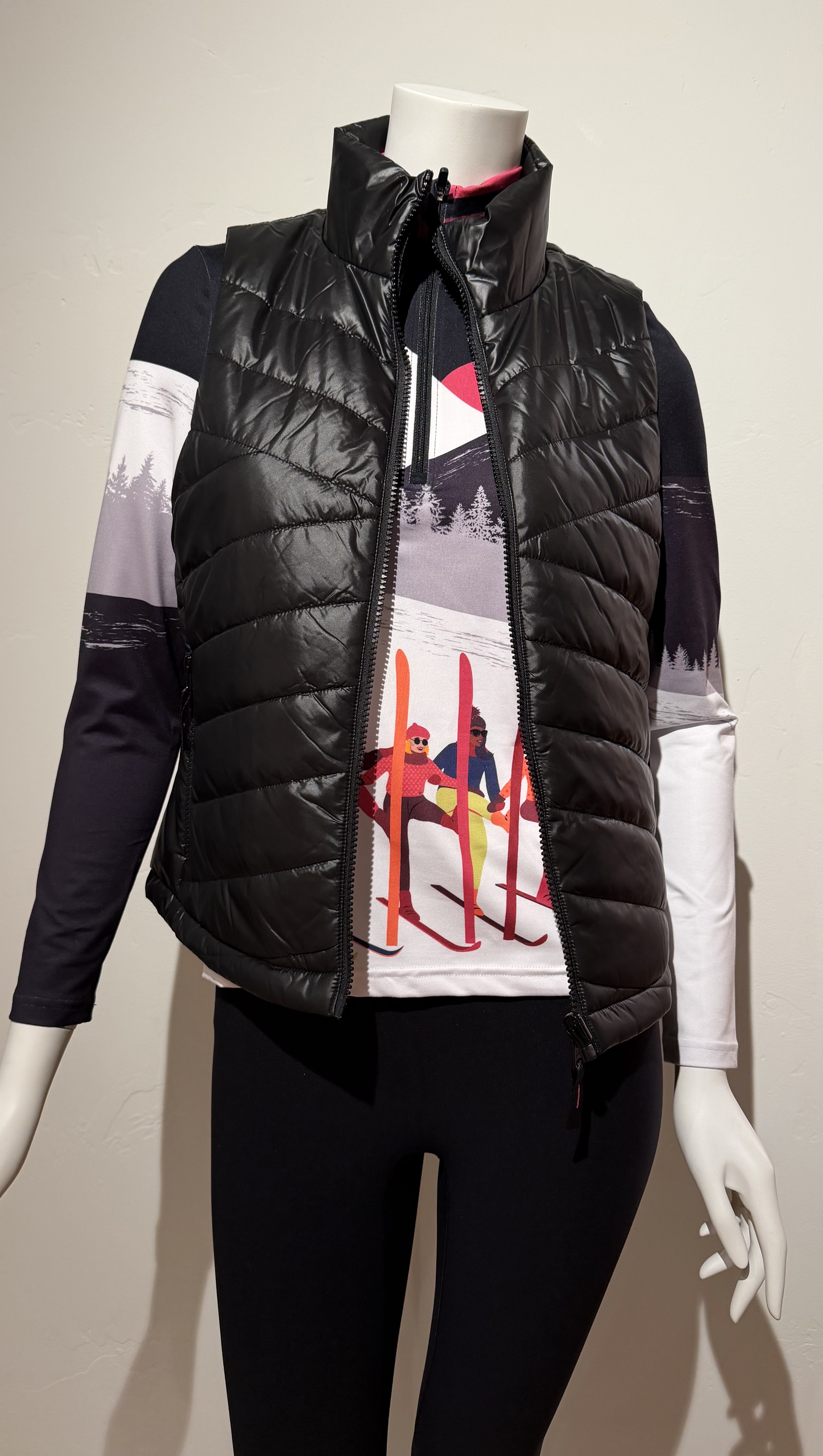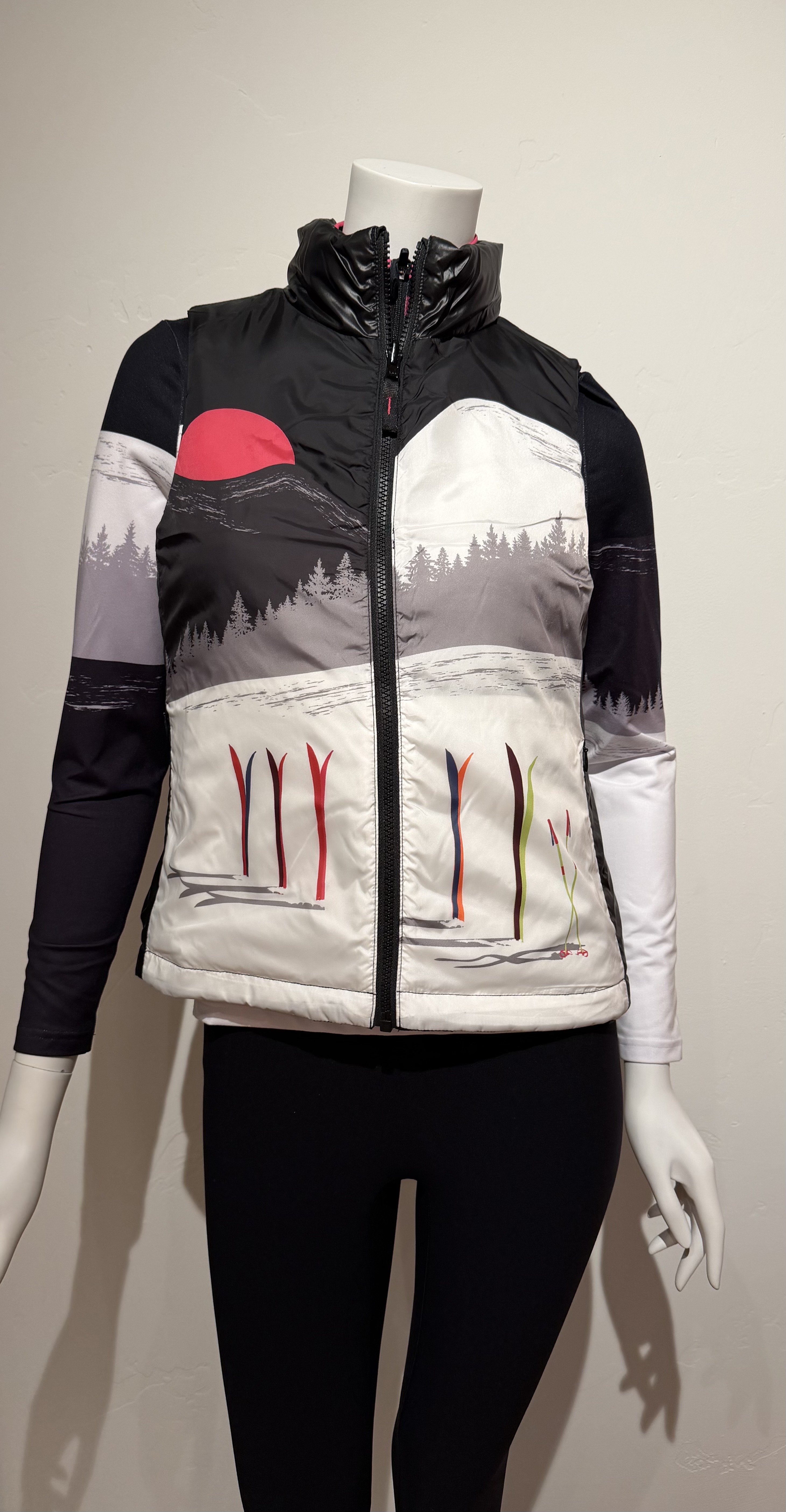 The Sela is a reversable vest...the red reverses to the white Multi skier print...the black reverses to the Amiche print and the snow reverses to the Graffiti heart print. We carry the coordinating zip turtlenecks